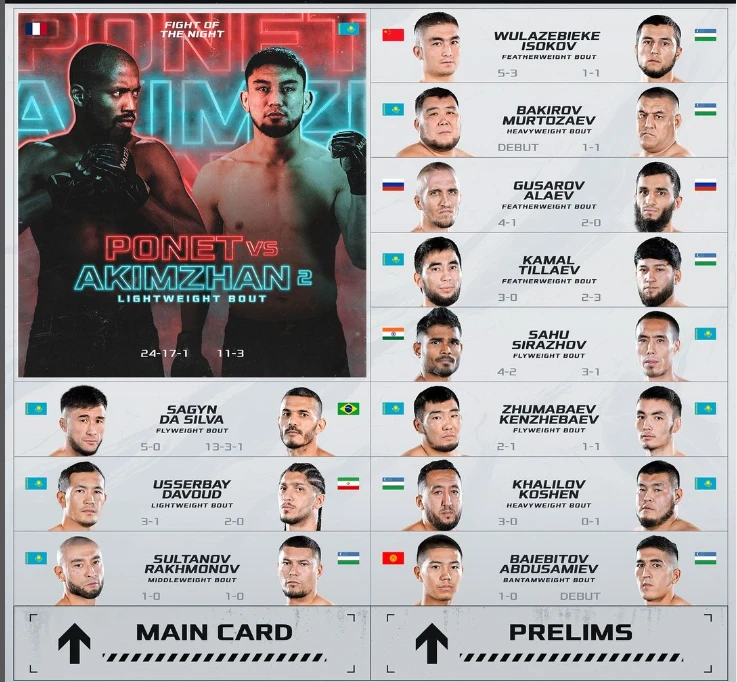 Реванш Акимжан – Поне, возвращение Сагына и Султанова. Где и во сколько смотреть NAIZA 67